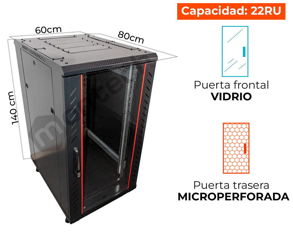 Gabinete de Piso para Servidores / 22 RU / 60x80x116 cm (AnchoxProf.xAlt.) / Puerta Frontal Vidrio Posterior Microperforada