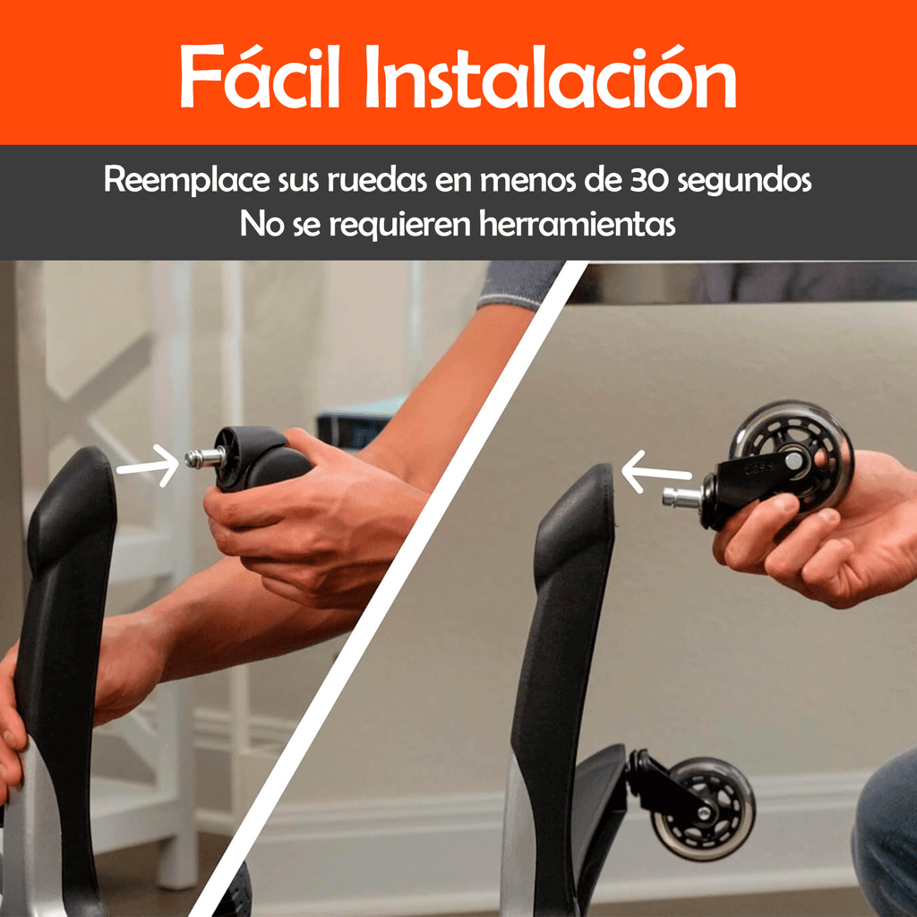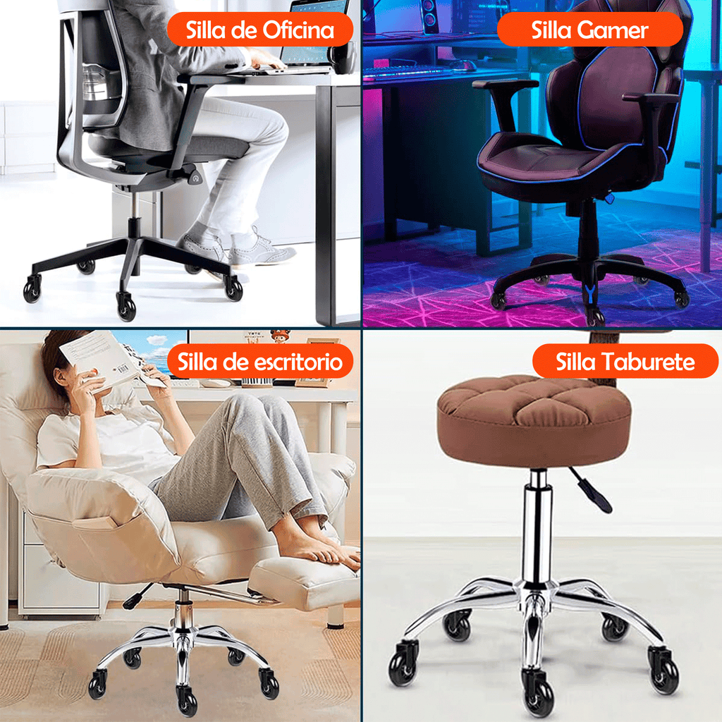 Rodamiento silencioso y suave: nuestras ruedas giratorias para sillas de oficina están diseñadas para ser silenciosas, eliminando la fricción y los ruidos chirriantes para mantener un ambiente de trabajo silencioso y reducir el ruido. La suave acción de rodadura minimiza el impacto en el piso y reduce el desgaste, evitando que la silla se tambalee o se balancee, lo que mejora la comodidad del usuario. Además, extiende la vida útil de las ruedas.